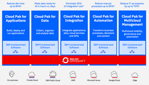 Aquí es entonces a donde entra el concepto de los Cloud Paks de IBM. Son software con tecnología de Inteligencia Artificial para La Nube (o Multi Nube) Híbrida , que nos permite implementar por completo flujos de trabajo inteligentes la empresa u organización, para acelerar el camino a la transformación digital en lo que a Contenedores se refiere.